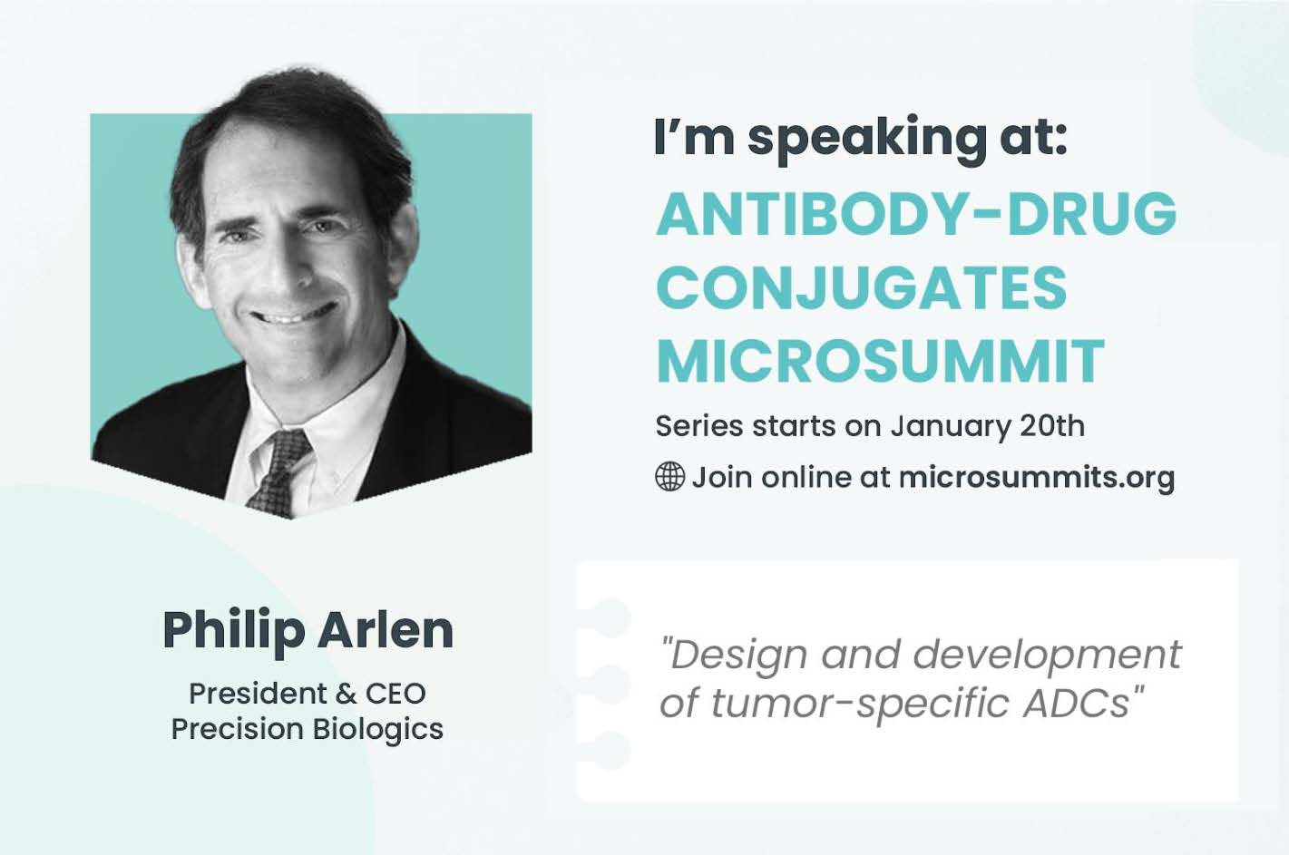 Philip M. Arlen, M.D., will present an online talk at the third and last session of the Antibody-Drug Conjugates MicroSummit, entitled “Design and Development of a tumor-specific antibody-drug conjugate.”